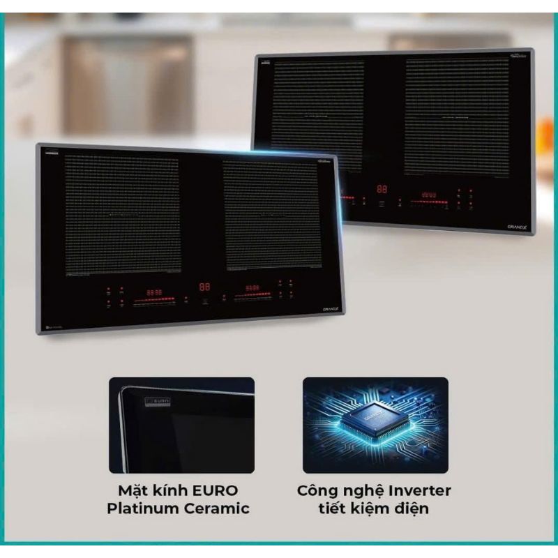Bếp từ đôi GrandX GX IP659SE hiện đại, sang trọng và tiết kiệm điện, kết hợp thiết kế tinh tế, mặt kính Euro Platinum cao cấp, công nghệ Bridge Inverter tiên tiến và công suất mạnh mẽ 2.000W mỗi vùng (Booster 2.300W). Sản phẩm mang đến trải nghiệm nấu ăn nhanh chóng, tiện lợi, an toàn và bền bỉ, phù hợp cho mọi gia đình.